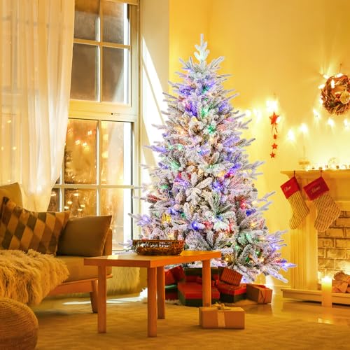 GOPLUS Sapin Noel Lumineux avec 250 LED, Sapin de Noel Artificiel 180 CM avec Neige Floquée et 928 Branches en PVC, Montage Facile pour Décoration Noël