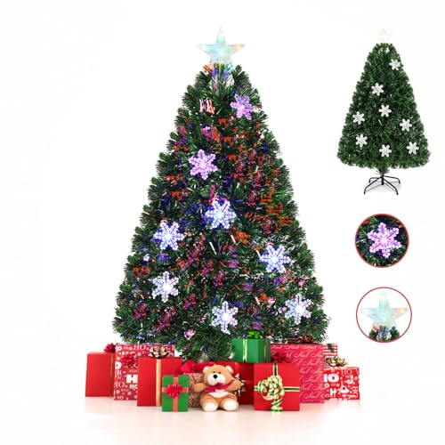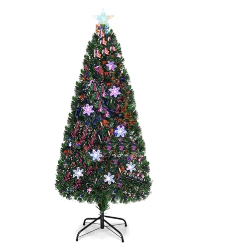 GOPLUS Sapin de Noël Artificiel 150cm, Sapin de Noel Lumineux LED Fibre Optique avec 24 Flocons de Neige Lumières et Etoile Sommet, 170 Branches Touffues, Décoration Noël