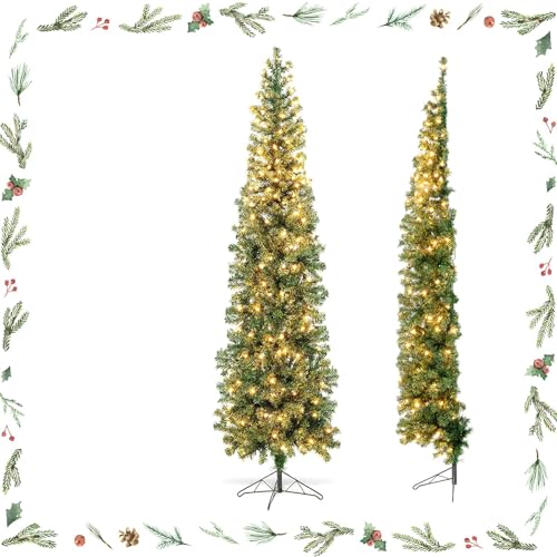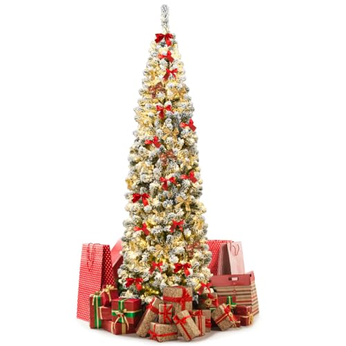 GOPLUS Sapin de Noel Artificiel Lumineux 225cm, Sapin Noel Mince Ennneigé à Crayons avec 350 LED & 641 Branches en PVC, Décoration Noël pour Maison Entreprise