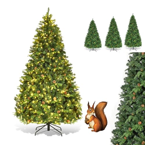 GOPLUS Sapin de Noel Artificiel 225 cm, Sapin de Noel Lumineux avec 540 LED Blanche Chaude, 71 Pommes de Pin, Branches Touffues, Décoration Noël pour Maison Entreprise Magasin