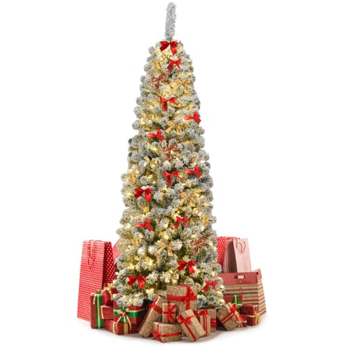 GOPLUS Sapin de Noel Artificiel Lumineux 135cm, Sapin Noel Mince Ennneigé à Crayons avec 150 LED & 242 Branches en PVC, Décoration Noël pour Maison Entreprise