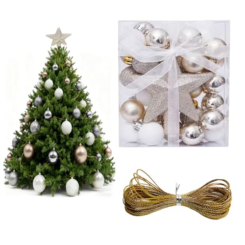 Boules de Noel 44 Pièces, Boule de Noel Or Blanc, Decoration Noel Sapin Plastique, Boules et Étoiles de Sapin de Noël, Suspendues Ornements pour Arbre de Noel Maison Jardin