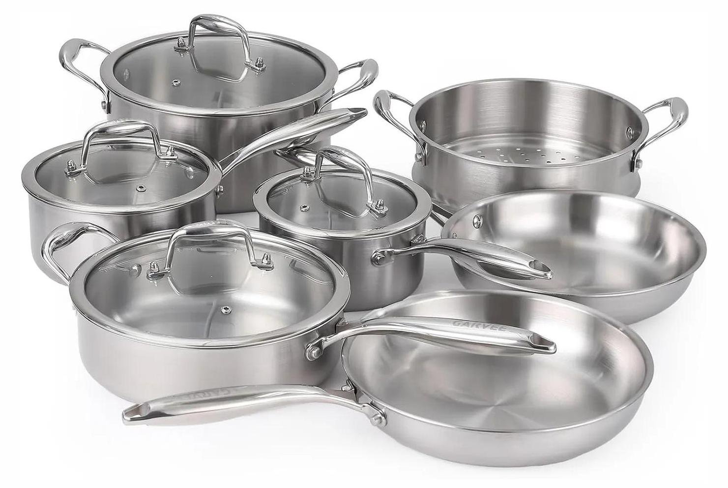 Batterie de cuisine - 11 pièces - Acier inoxydable 316, 3 couches - Poêles à frire, casseroles, sauteuse, marmite - Couvercles en verre - Compatible avec tous les types de cuisinières, y compris l'induction - Argent