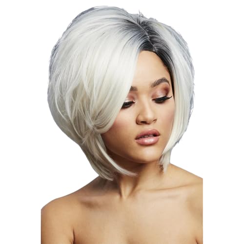 Smiffys Perruque Fever Savanna, True Blend, Blond platine, Carré asymétrique, raie de côté, 30cm/12pouces Halloween