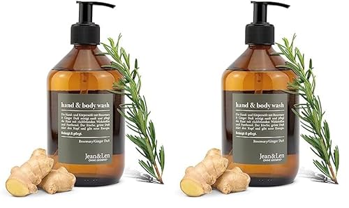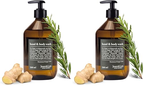 Jean & Len Savon pour les mains et la douche Rosemary et Ginger, nettoie et soigne la peau, Parfum frais et épicé, Savon liquide sans silicone, parabène & microplastique, Bouteille en verre 500 ml