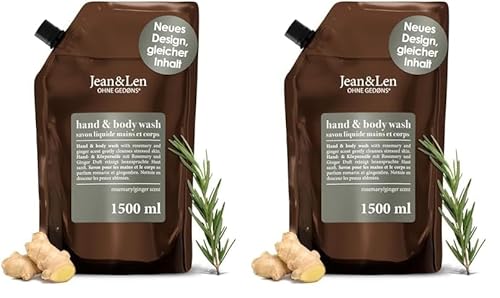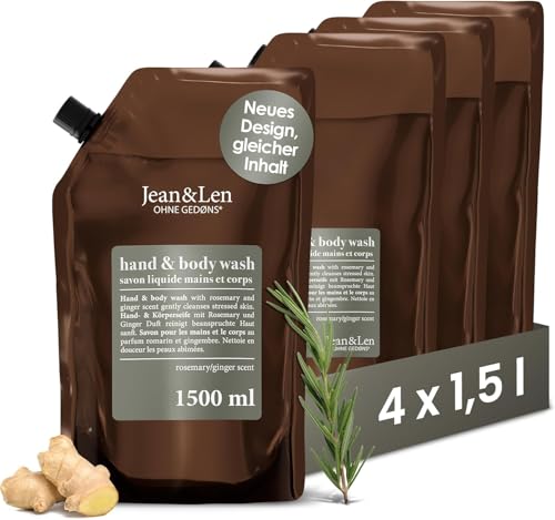 Jean & Len Recharge de savon pour les mains et le corps au romarin et au gingembre, nettoie et soigne la peau, set pratique, parfum frais et épicé, savon liquide, sans silicone & parabène, 4 x 1,5L
