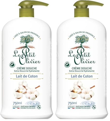LE PETIT OLIVIER - Crème Douche Extra Douce & Hydratante - Lait De Coton - Pour Toute La Famille - PH Neutre Pour La Peau - Sans Savon, Sans Colorant - Fabriqué En France - 750 ml (Lot de 2)