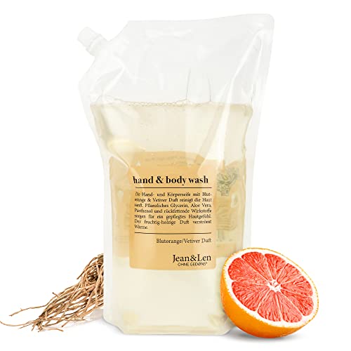 Jean & Len Nettoyant pour les mains et le corps Orange sanguine & Vétiver, parfum fruité et boisé, savon liquide en recharge, sans parabènes, silicones & microplastiques, végétalien, 1,5L