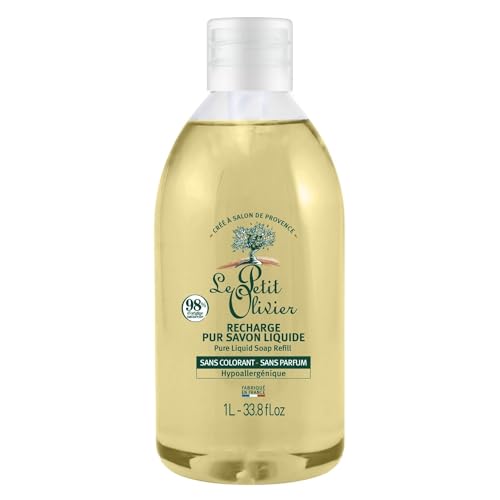 LE PETIT OLIVIER - Recharge Pur Savon Liquide - Hypoallergénique - Sans Parfum & Sans Colorant - Nettoie La Peau En Douceur - 98% D'Origine Naturelle - Cuit au Chaudron - Fabriqué En France - 1L