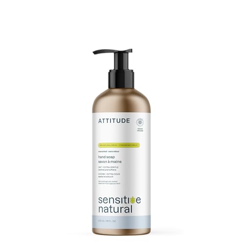 ATTITUDE Savon à Mains Doux pour Peau Sensible, certifié EWG, enrichi à l’avoine, testé dermatologiquement, végan, sans parfum, bouteille aluminium, 473 mL