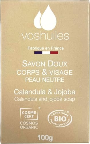 VOSHUILES - Savon Artisanal Calendula & Jojoba - Saponifié à Froid - Peaux Neutres et Sensibles - Surgras et Sans Parfum - Glycérine Naturelle - 100g