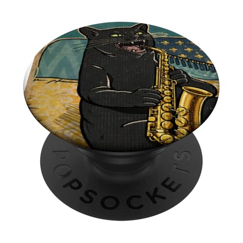 T-Shirt rétro Amusant avec Motif de Chat Jouant du Saxophone PopSockets PopGrip Adhésif