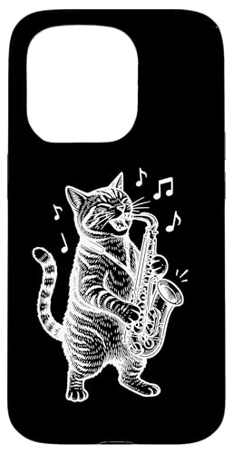 Coque pour iPhone 15 Pro Chat Jouant du Saxophone, Joli Motif de Chaton saxophoniste