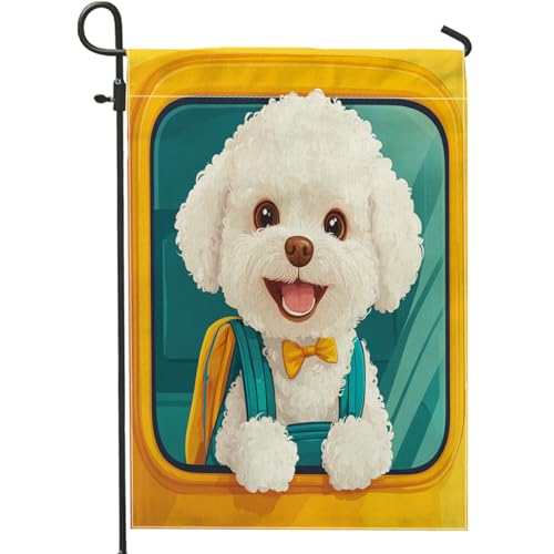 Bichon Frise Dog School Bus Garden Drapeaux de jardin 30,5 x 45,7 cm double face pour l'extérieur, chiot amusant pour la rentrée scolaire, drapeaux d'extérieur en toile standard, pour animaux
