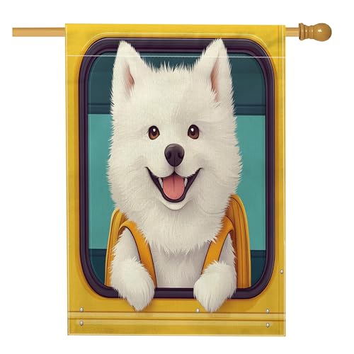 Samoyède Dog School Bus Front Yard Backyard Toile de jute Vertical Maison Drapeaux 71,1 x 101,6 cm Double face pour extérieur, chiot amusant pour la rentrée scolaire, Chiot à la maison, décoration
