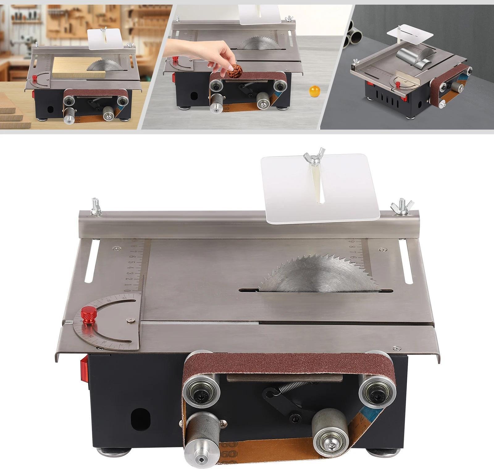 Mini scie circulaire sur table - Scie sur table avec ponceuse à bande - Puissance 200 W - Compacte - Pour bois, plastique, pierre, métal - Alimentation secteur CA - Gris