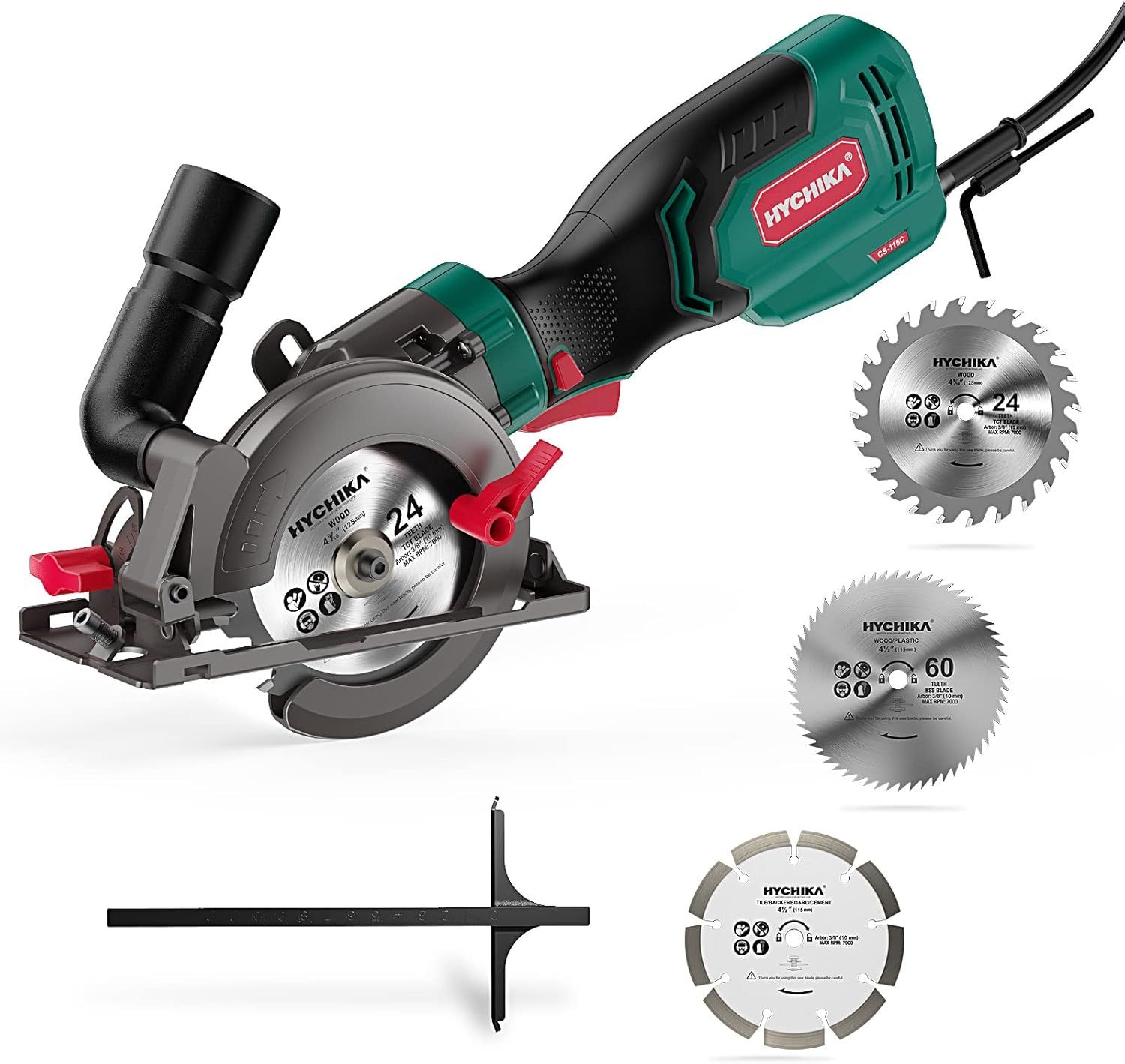 HYCHIKA Scie Circulaire, 750W 3500RPM Petite Scie Circulaire, 3 Lames(115 et 125mm) Profondeur de Coupe 48mm(90°), 32mm(45°), Idéal pour Couper du Bois, Carrelage, Métal Mou