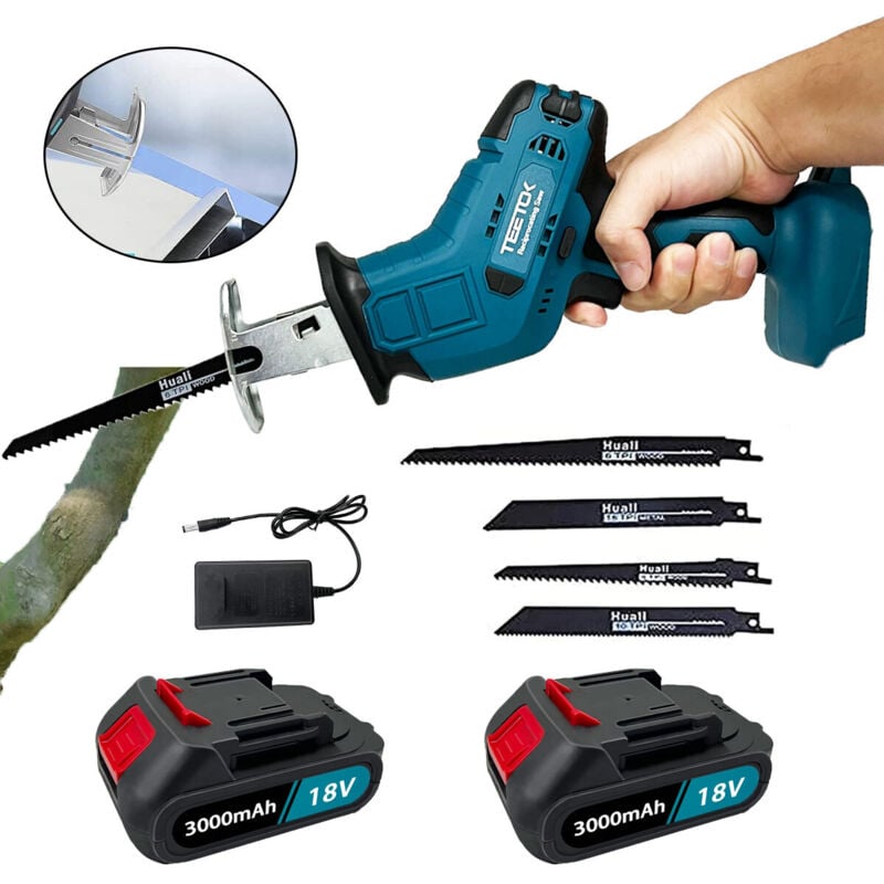 Teetok - Scies alternatives, scie alternative électrique sans fil pour jardin, 4 lames, coupe du bois, lampe de travail led, + 2 piles de 3,0 Ah +