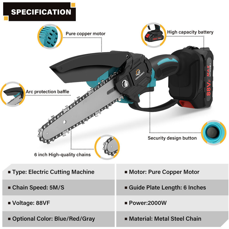 Tronçonneuse à batterie 6 '' 88VF 2 Batterie Portable Scie à Chaine Électrique Sans fil Jardin Logging Fantablau