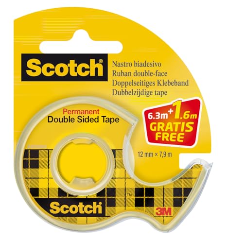 Scotch Ruban Adhésif Double-Face - 1 Rouleau 12,7 mm x 7,89 m sur dévidoir manuel (25% GRATUIT) - Idéal pour le Bureau et l'École