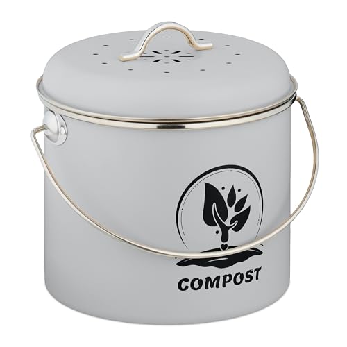Seau à compost, 5 litres, petite poubelle, 2 filtres à charbon actif, couvercle, pour la cuisine, gris - Relaxdays
