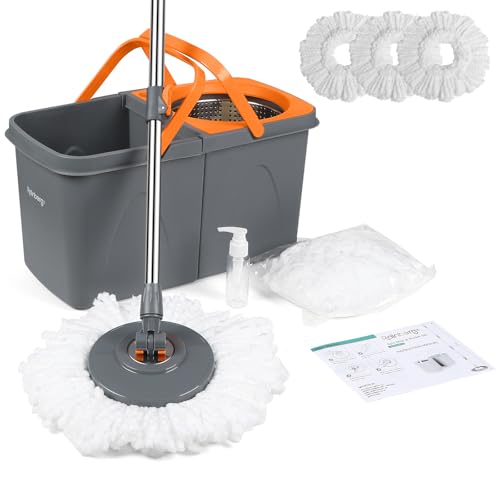 Rainberg Ensemble serpillère et Seau avec 3 têtes supplémentaires, Manche Extensible de 130 cm, têtes en Microfibre lavables en Machine, système d'essorage Automatique, Gris et Orange