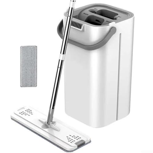 DAZZLEEX Ensemble de balai plat mains libres avec seau pour nettoyage de sol humide et sec Gris 38 x 22 x 20 cm ABS Outil pour nettoyage paresseux (Blanc)