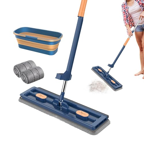 Vadrouille de Nettoyage Plate Réglable Rotative à 360°, Grande Balai Plat Lavage Sol avec Eau Essoreur, Balai Serpillere Microfibre pour Sol, Balai Raclette de Sol (Seau Pliant Bleu)