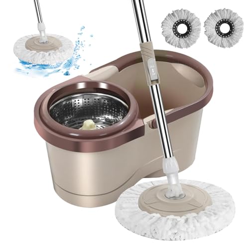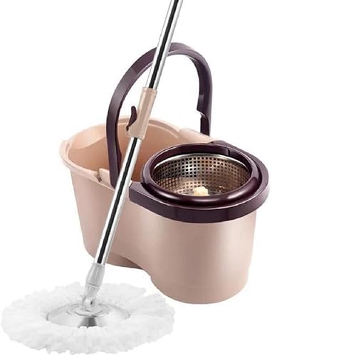 JUNYFFF Balai Serpillère Essoreur avec Seau, Rotatif À 360° Balais Nettoyer Sol, Vadrouille Rotative pour Le Nettoyage du Sol, Ensemble De 1X Vadrouille Et 1X Seau, 4X Tête De Vadrouille,Marron