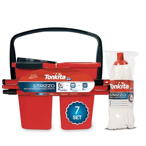 TONKITA Strizzo Kit de Nettoyage de Sol 3 pièces, Seau avec 2 Bols avec essoreuse 14 litres, poignée 130 cm en Acier Peint modulaire – Lot de 7
