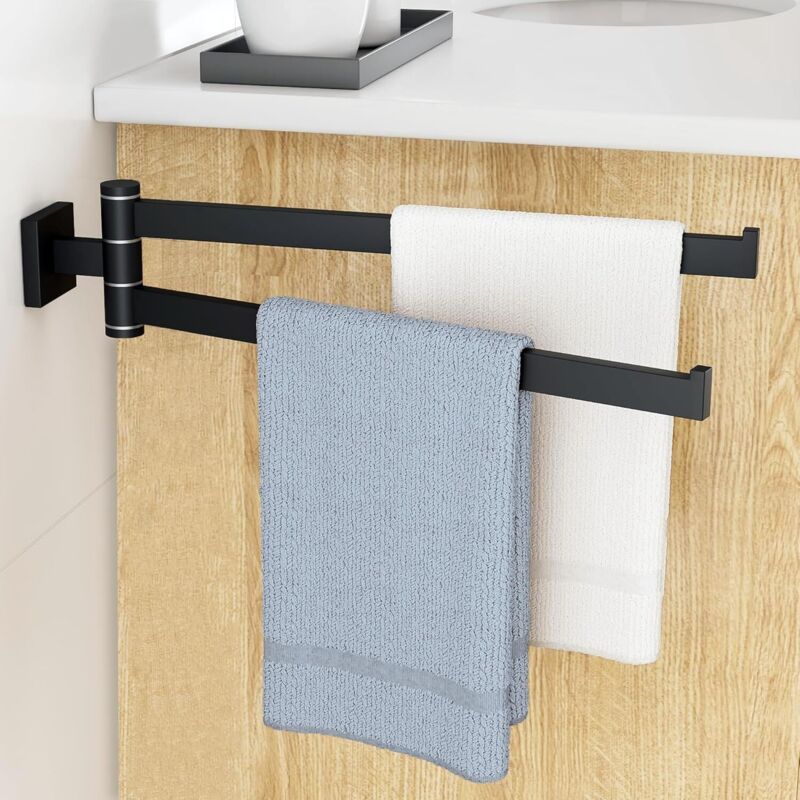 Porte Serviette avec 2 Barres Salle de Bain, Porte Serviette Mural 180° Rotatives en Acier Inoxydable, Sèche-Serviettes Oganizer, 40CM Noir Mat,