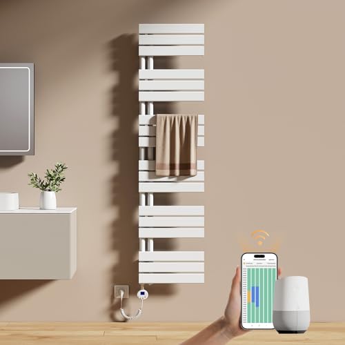 EMKE Sèche-Serviettes Électrique avec WiFi Thermostat 132x40cm 600 Watt Blanc, Sèche-Serviettes Électrique avec Support De Serviette Inclus Résistance Chauffante avec Minuterie