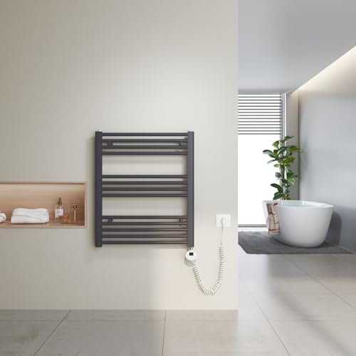 Heilmetz Seche Serviette Electrique 70x60cm Anthracite 300W, Chauffe Serviette Salle de Bain Tube Droit, avec Thermostat Digital avec Fonction minuterie