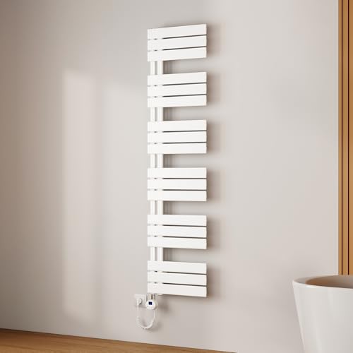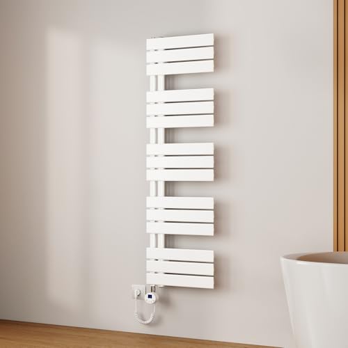 EMKE Sèche-Serviettes Électrique avec Thermostat 132x40cm 600 Watt Blanc, Sèche-Serviettes Électrique avec Support De Serviette Inclus Résistance Chauffante avec Minuterie