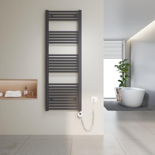 Heilmetz Seche Serviette Electrique 140x50cm Anthracite 600W, Chauffe Serviette Salle de Bain Tube Droit, avec Thermostat Digital avec Fonction minuterie