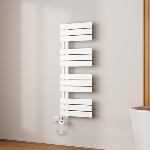 EMKE Sèche-Serviettes Électrique avec Thermostat 104x40 cm 400 Watt Blanc, Sèche-Serviettes Électrique avec Support De Serviette Inclus Résistance Chauffante avec Minuterie
