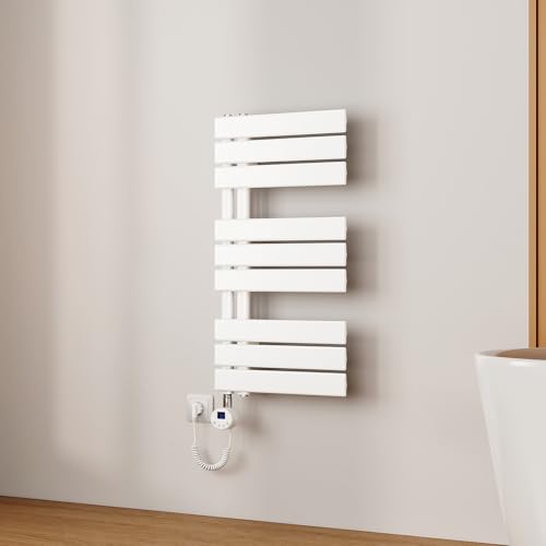 EMKE Sèche-Serviettes Électrique avec Thermostat 76x40 cm 400 Watt Blanc, Sèche-Serviettes Électrique avec Support De Serviette Inclus Résistance Chauffante avec Minuterie