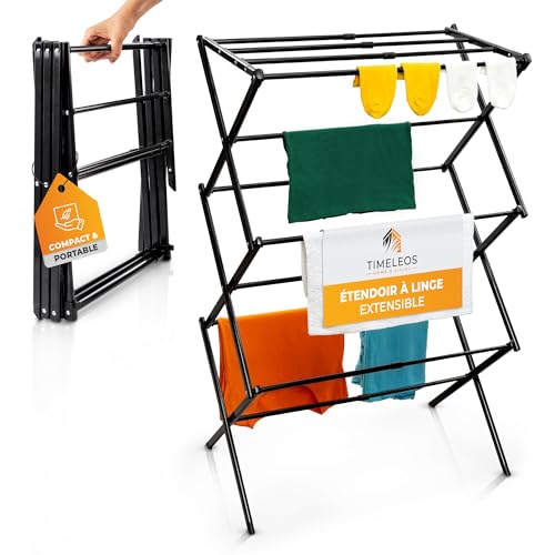 TIMELEOS Etendoir Linge Interieur Pliable - Mini Sechoir a Linge Robuste - Sèche Linge Extensible Plus Peu Encombrant, Petit Étendoir à Linge Intérieur - Idéal pour l'intérieur ou Le Camping, Noir