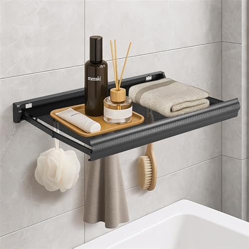 Todeco Sechoir Linge Mural Rétractable avec Étagère Filet & 8 Crochets, Étagère de Douche sans Percage, Étendoir à Linge Design Pliable Invisible, Rail À Crochets pour Buanderie Salle de Bain Cuisine