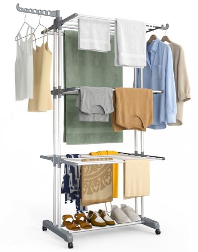 HOMIDEC Etendoir Linge, 4 Niveaux Grande Sechoir a Linge Pliable avec Roues, Acier Inoxydable Seche Linge Etendoir pour Intérieur et Extérieur, Gris