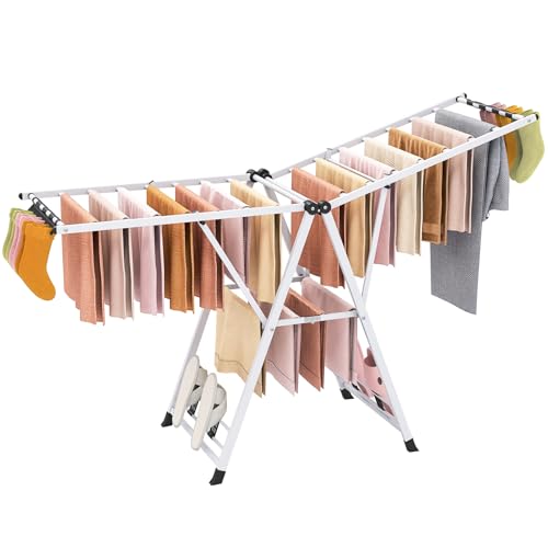 COSTWAY Etendoir Linge Pliable, Sechoir a Linge Pliable 18 Barres, Cadre en Acier, Hauteur Réglable 99-158 cm, Pinces à Chaussettes, 4 Porte-Chaussures, Tancarville Linge Intérieur (Blanc,163 cm)