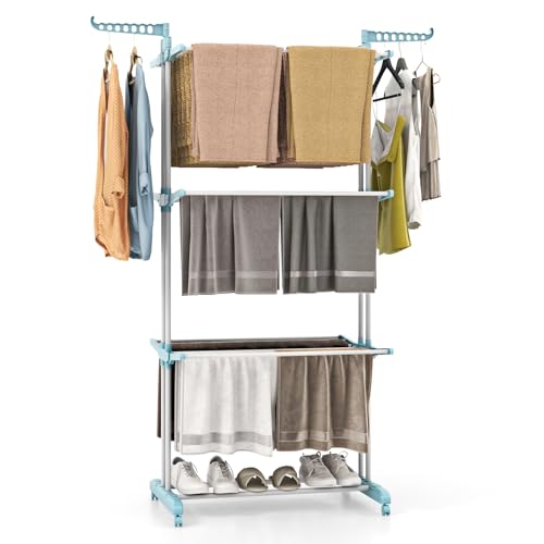 COSTWAY Sechoir à Linge Pliable 3 Niveaux, Étendoir Linge à roulettes en Métal, Sechoir Tancarville Solide avec 2 Porte-cintres, Porte-Chaussures, Seche Linge Intérieur Extérieur (Bleu Clair)