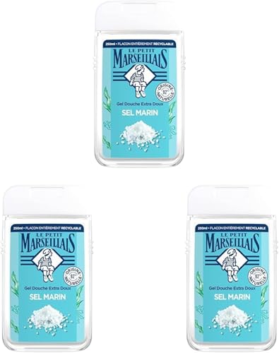 Le Petit Marseillais, Gel Douche Extra Doux Sel Marin (flacon de 250 ml) – 92% d'ingrédients d'origine naturelle et pH neutre pour la peau – Flacon entièrement recyclable (Lot de 3)
