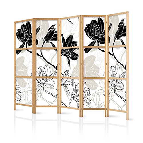 murando - Paravent Intérieur Japonais 225x172 cm - Séparateur de Pièce en Bois Naturel et Toile Imprimée - Paravent Oriental Portable et Pliable - Magnolias en Noir Et Blanc p-B-0011-z-c