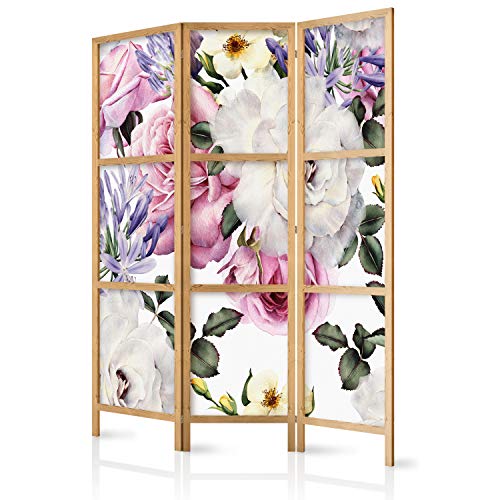 decomonkey - Paravent décoratif intérieur Floral 225x172 cm - Cloison de séparation - Paravent en Bois - Marron Blanc Violet - Aquarelles Bouquet coloré Fleurs Inscriptions Plantes romantiques