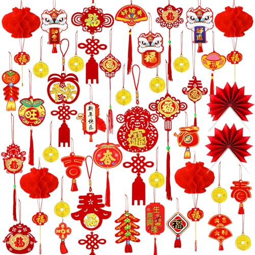JUNEBRUSHS Lot de 43 décorations de Nouvel An chinois 2025, pendentifs nœud chinois en forme de serpent rouge, décoration de Nouvel An lunaire, pendentifs de festival de printemps pour maison, bureau,
