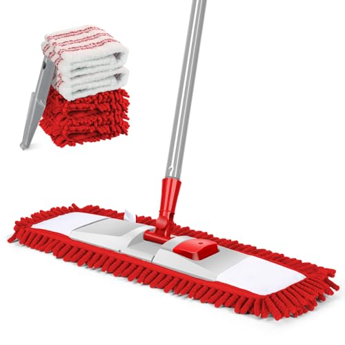 Myiosus Balai Serpillère, Balais Nettoyer Sol Rotatif à 360°, Balai Microfibre Plat avec Manche Télescopique de 127 cm, 4 Tampons en Chenille Lavables pour Bois Dur, Carrelage, Stratifié