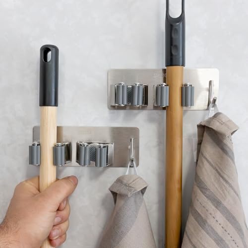 Piyl Support mural pour balai et serpillère – 5 supports et 4 crochets pour balais – Organiseur de serpillère en acier inoxydable robuste pour la maison, la cuisine, le jardin, la buanderie, le