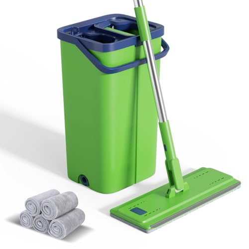 Eukue Serpillère Seau Essoreur, Balai Serpillière Plat Microfibre avec 5 Serpillères Réutilisables, Serpillère et Seau Essoreur avec Manche INOX, Serpillere Balais Nettoyer Sol(Vert)