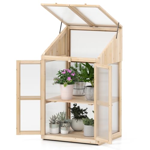 COSTWAY Serre de Jardin à 2 Niveaux en Bois de Sapin 121 cm, Mini Serre avec Protection d'Étagère Toit Rabattable Transparent Porte Verrouillable Étagères Amovibles, pour Intérieur/Extérieur